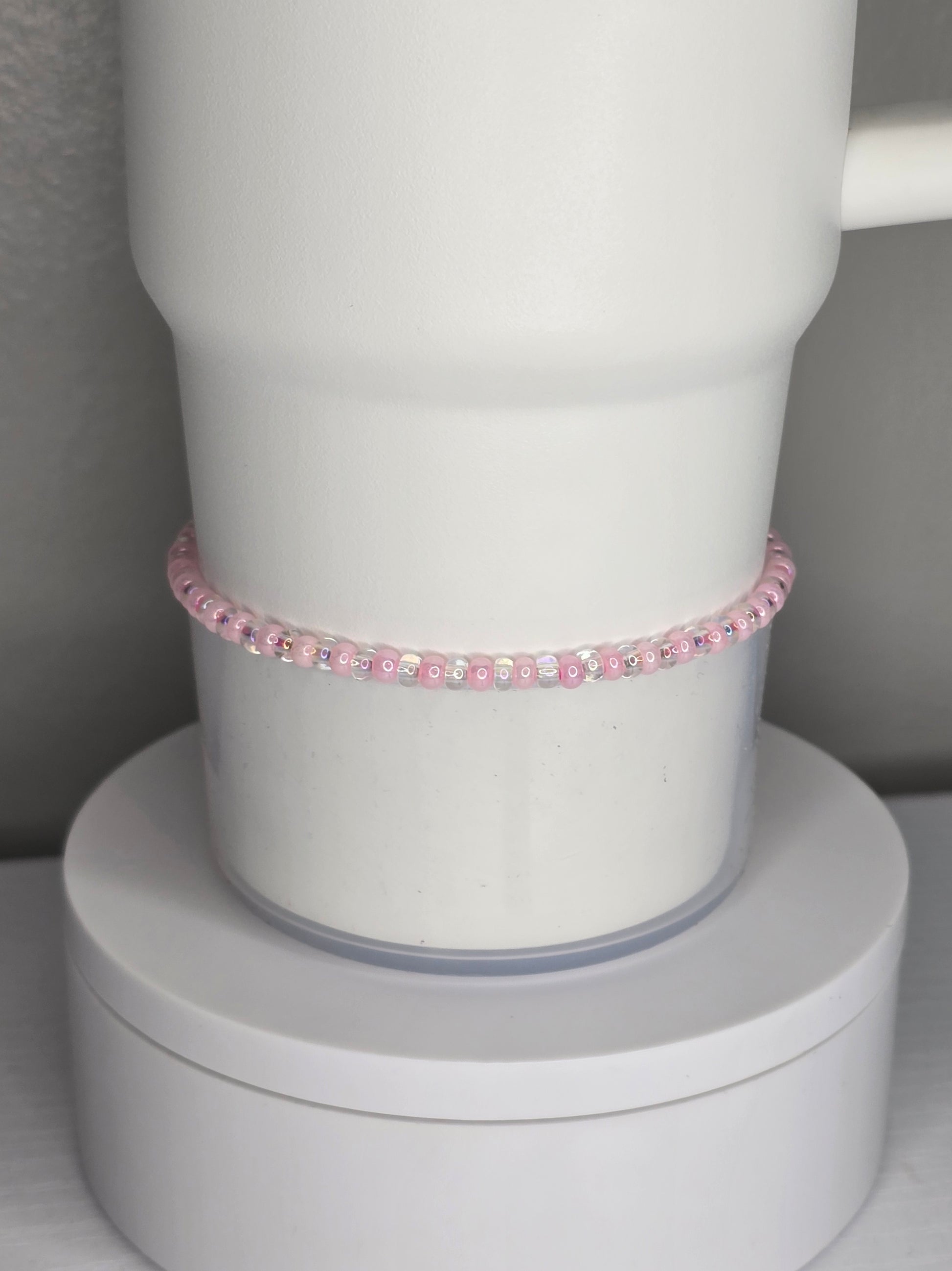 One simple boot bracelet of baby pink and iridescent czech seed beads alternating.