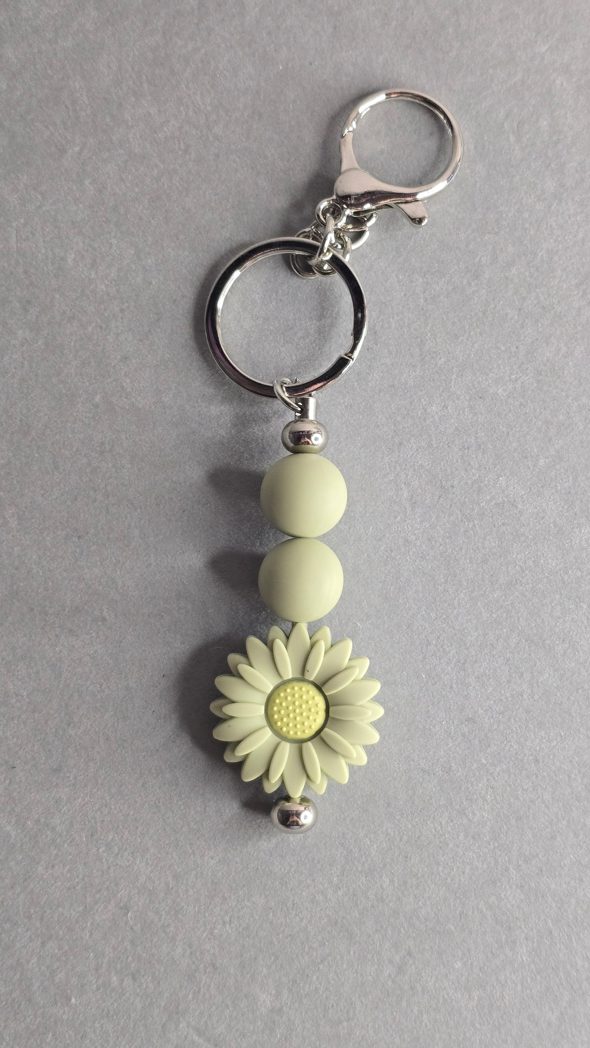 3 inch keychain with large lobster clasp and key ring attached to metal bar with silicone beads.