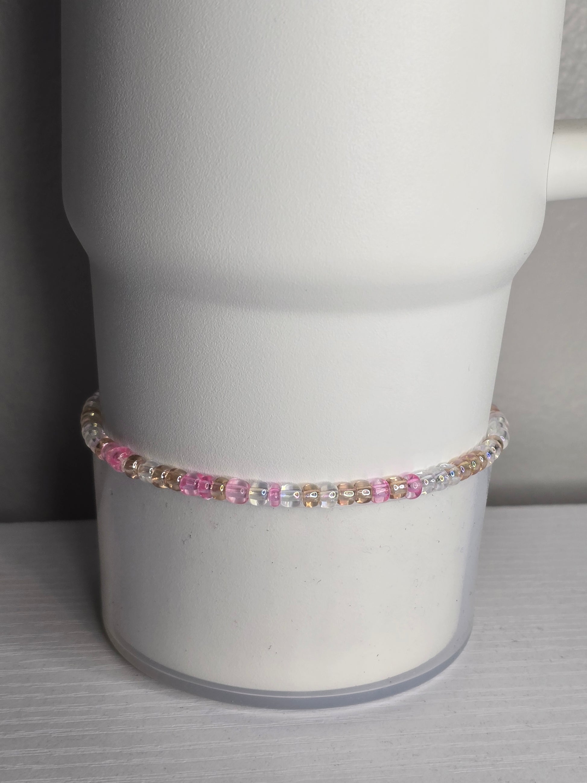 One simple boot bracelet of pink, iridescent and beige glass seed beads.
