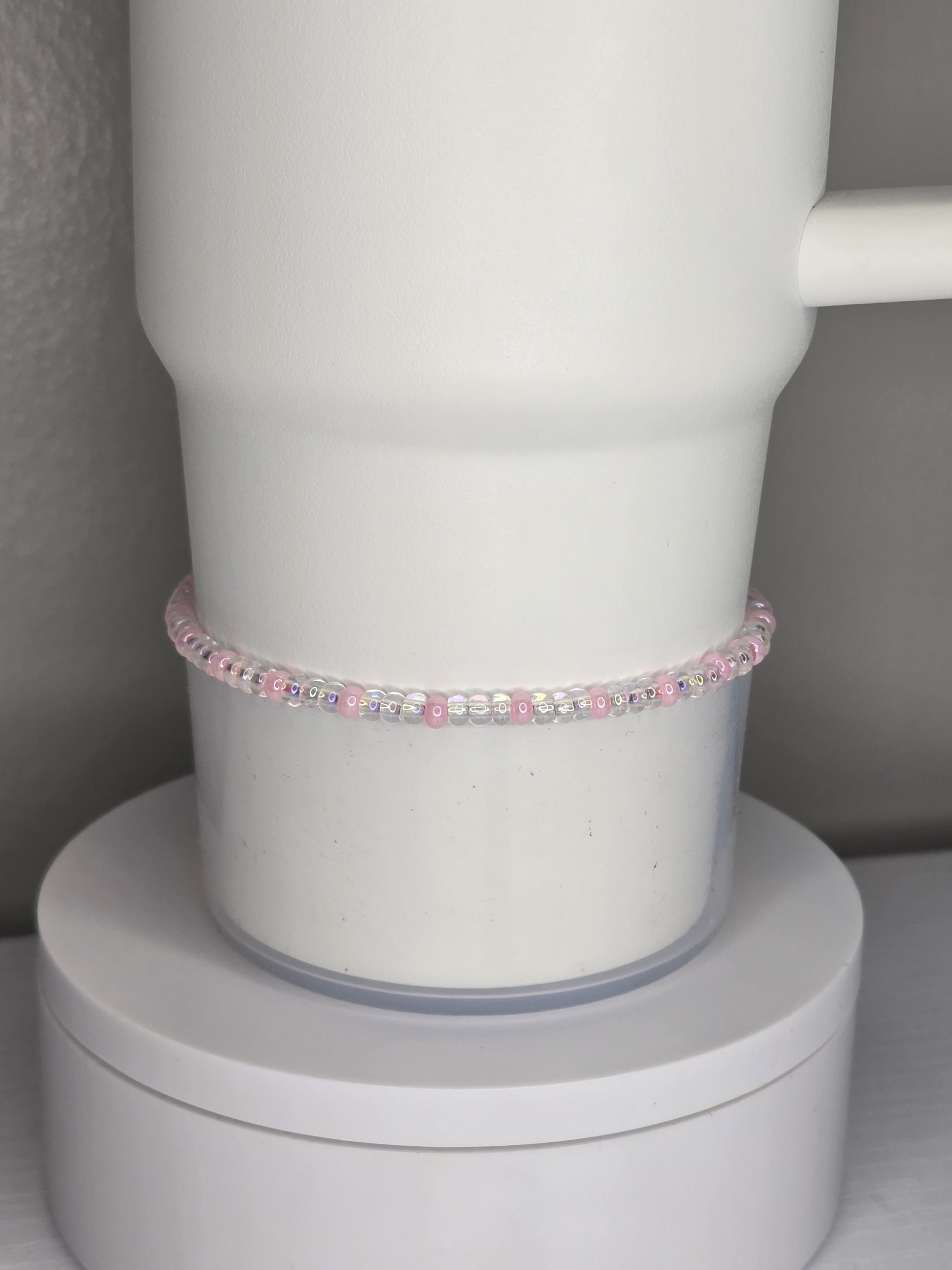 One simple boot bracelet of baby pink and iridescent czech seed beads alternating.